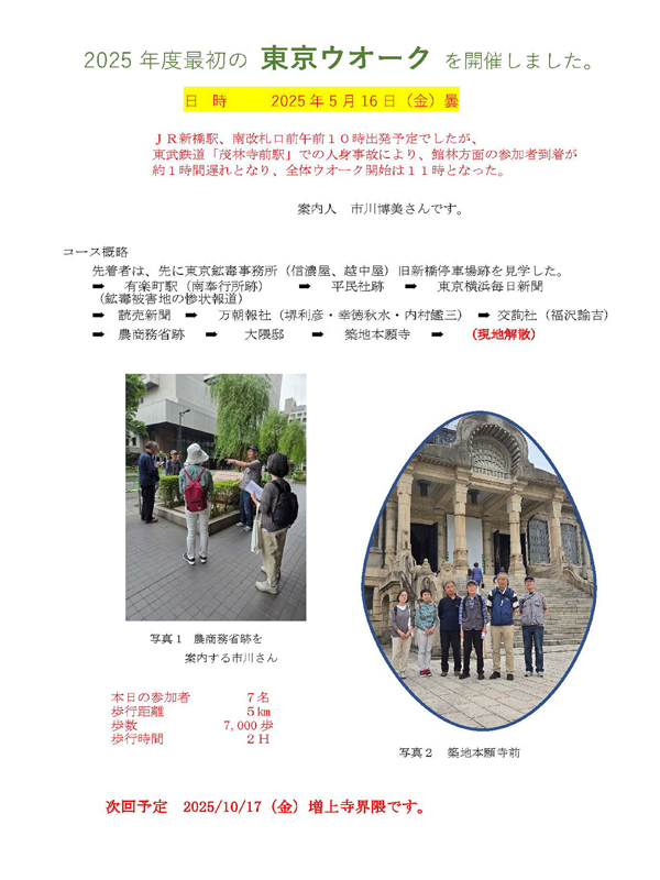 田中正造記念館の令和7年度最初の 「足尾鉱毒事件関連東京ウォーク」が開催されました。 令和7年(2025年)5月16日(金) 参加者:7名 歩行距離:5km ウォーク時間:2時間 歩数:7,000歩 【区間】 (集合)JR新橋駅 ~(解散)築地本願寺 *コース詳細 別紙参照 ↓クリックするとPDFで大きく見られます