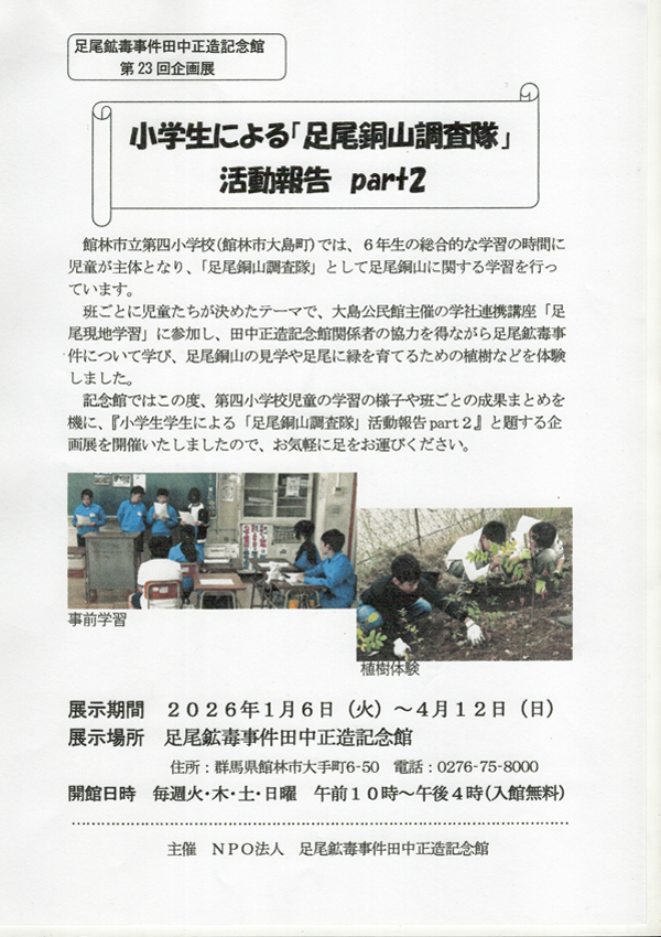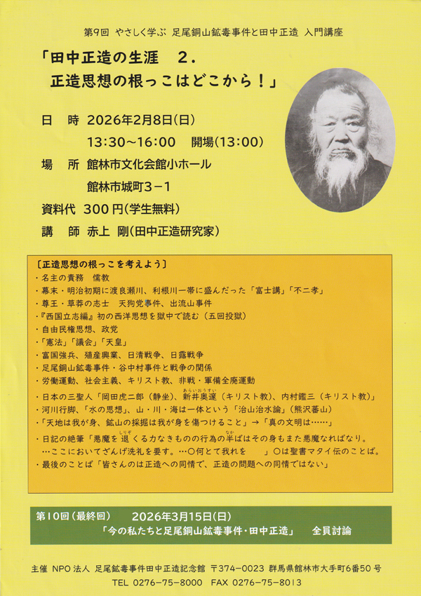 イベントのご案内 ![]() 【お知らせ】 やさしく学ぶ 足尾銅山鉱毒事件と田中正造入門講座 第9回 『田中正造の生涯 2.』 − 正造思想の根っこはどこから! − 日時 : 2026年2月8日(日) 13:30 〜 16:00(開場 13:00) 場所 : 館林市文化会館 小ホール (館林市城町3−1) 資料代 : 300円(学生無料) 講師 : 赤上 剛氏(田中正造研究家) 是非、ご来館ください。お待ちしています。 ![]() ![]() 【第23回 企画展】 小学生による「足尾銅山調査隊」 ― 活動報告 part 2 ―』 展示期間 : 2026年1月6日(火) 〜 4月12日(日) 会場 : 足尾鉱毒事件田中正造記念館 企画展示室 是非、ご来館ください。お待ちしています。 ![]() ![]() 【お知らせ】 やさしく学ぶ 足尾銅山鉱毒事件と田中正造入門講座 第8回 『田中正造の生涯 1.』 名主、自由民権家、県議・衆議院議員、鉱毒事件闘争、谷中村闘争 日時 : 2025年11月9日(日) 13:30 〜 16:00(開場 13:00) 場所 : 館林市文化会館 小ホール (館林市城町3−1) 資料代 : 300円(学生無料) 講師 : 赤上 剛氏(田中正造研究家) 是非、ご来館ください。お待ちしています。 ![]() ![]() 今回のフィールドワークは、今年の八月にオープンしたばかりの 「足尾銅山記念館」を見学する予定 です。 足尾銅山の開発振興、町の発展、公害の発生と、 その歴史が展示されており被害地の立場とは違った視点での足尾銅山を 認識できる機会かと思いますのでじっくりと御覧ください。 恒例の体験植樹も行います。足尾に緑を復元する一助になると思います。 皆様のご参加をお願いいたします 。 足尾・植樹と「足尾銅山記念館」を訪ねる 【日時】 2025年11月2日(日)雨天決行 受付開始 7:30 / 出発 8:00 / 解散見込 18:00 【集合場所】 館林市南面駐車場(館林市役所南側駐車場) 【募集定員】 45名(先着順) ※大型バス 定員になり次第締め切ります 【参加費】 5,000円 当日集合場所にて納入してください (参加費には、植樹費用、入館料、バス代、資料代を含みます) 皆様のご参加をお待ちしております。 ![]() ![]() 【お知らせ】 やさしく学ぶ 足尾銅山鉱毒事件と田中正造入門講座 第7回 『足尾銅山鉱毒事件で消えた二つの村 松木村と谷中村』 その2『谷中村』 日時 : 2025年10月12日(日) 13:30 〜 16:00(開場 13:00) 場所 : 館林市文化会館 小ホール (館林市城町3−1) 資料代 : 300円(学生無料) 講師 : 赤上 剛氏(田中正造研究家) 是非、ご来館ください。お待ちしています。 ![]() ![]() 【第22回 企画展】 『足尾銅山鉱毒事件 女たちの闘い ― 女押し出しと支援する人々 ―』 展示期間 : 2025年9月16日(火) 〜 12月21日(日) 会場 : 足尾鉱毒事件田中正造記念館 企画展示室 是非、ご来館ください。お待ちしています。 ※当初9月6日(土)から『第22回企画展』の展示を予定しておりましたが 諸事情により9月16日(火)から展示することになりました。 9月6日(土)〜14日(日)の間にご来館を予定されていた皆様にはご迷惑を おかけし、大変申し訳ございません。12月21日(日)まで展示しておりま すので、ぜひご来館ください。お待ちしております。 ![]() ![]() 今回のフィールドワークは、鉱毒の被害地であり、 正造の分骨地の一つである足利市を訪ねます。 ここでは田中正造の最側近として最後まで支えた嶋田宗三、 正造の甥で経済面で支援していた原田定助、 正造の妹リンの墓地を訪ね、墓参を計画しました。 徳蔵寺では、当時4歳だったご住職に講演していただく予定です。 『鉱毒被害の激甚地、足利市を訪ねる』 (田中正造ゆかりの地巡りとナシ狩り) 【日時】 2025年8月24日(日)雨天決行 受付開始 7:30 / 出発 8:00 / 解散見込 16:30 【集合場所】 館林市南面駐車場(館林市役所南側駐車場) 【募集定員】 45名(先着順) ※大型バス 定員になり次第締め切ります 【参加費】 5,000円 当日集合場所にて納入してください (参加費には資料代、保険料、梨2個(土産)を含む) ※梨狩りは別途受け付けます 皆様のご参加をお待ちしております。 ![]() ![]() 【お知らせ】 やさしく学ぶ 足尾銅山鉱毒事件と田中正造入門講座 第6回 『「直訴」の真相とその結果』 日時 : 2025年9月21日(日) 13:30 〜 16:00(開場 13:00) 場所 : 館林市文化会館 小ホール (館林市城町3−1) 資料代 : 300円(学生無料) 講師 : 赤上 剛氏(田中正造研究家) 是非、ご来館ください。お待ちしています。 ![]() ![]() 【お知らせ】 やさしく学ぶ 足尾銅山鉱毒事件と田中正造入門講座 第5回 『立ち上がった鉱毒被害民』 ― 示談・永久示談・押出し(請願行動)、 川俣事件弾圧まで ― 日時 : 2025年7月13日(日) 13:30 〜 16:00(開場 13:00) 場所 : 館林市文化会館 小ホール (館林市城町3−1) 資料代 : 300円(学生無料) 講師 : 赤上 剛氏(田中正造研究家) 是非、ご来館ください。お待ちしています。 ![]() ![]() 【お知らせ】 やさしく学ぶ 足尾銅山鉱毒事件と田中正造入門講座 第4回 『足尾銅山鉱毒事件で消えた二つの村 松木村と谷中村』 その1『足尾銅山の煙害で廃村になった松木村』 (足尾の最上流・渡良瀬川の源流) 日時 : 2025年6月22日(日) 13:30 〜 16:00(開場 13:00) 場所 : 館林市文化会館 小ホール (館林市城町3−1) 資料代 