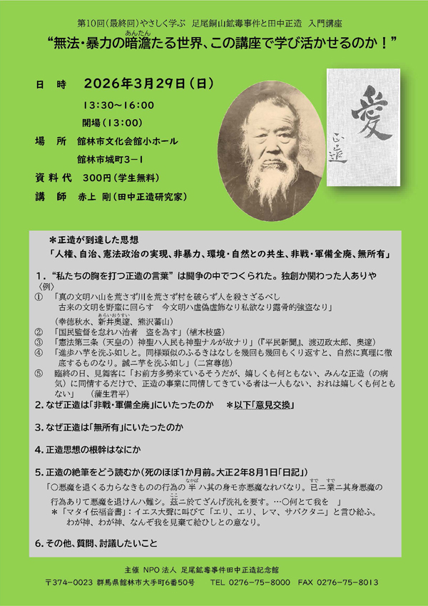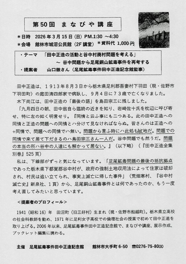 イベントのご案内 ![]() 【日時】 2026年3月15日(日)13:30〜16:30 【会場】 館林市城沼公民館 2階 講堂 (館林市松原1‐22‐22) 【講師】 山口 徹さん(足尾鉱毒事件田中正造記念館 監事) 【テーマ】「田中正造の活動と谷中村廃村問題を考える」 〜谷中問題から秋穂銅山鉱毒事件を再考する〜 ぜひご参加ください。 ![]() ![]() 【お知らせ】 やさしく学ぶ 足尾銅山鉱毒事件と田中正造入門講座 第10回『無法・暴力の暗澹あんたんたる世界、 この講座で学び活かせるのか!』 日時 : 2026年3月29日(日) 13:30 〜 16:00(開場 13:00) 場所 : 館林市文化会館 小ホール (館林市城町3−1) 資料代 : 300円(学生無料) 講師 : 赤上 剛氏(田中正造研究家) 是非、ご来館ください。お待ちしています。 ![]() ![]() 【お知らせ】 やさしく学ぶ 足尾銅山鉱毒事件と田中正造入門講座 第9回 『田中正造の生涯 2.』 − 正造思想の根っこはどこから! − 日時 : 2026年2月8日(日) 13:30 〜 16:00(開場 13:00) 場所 : 館林市文化会館 小ホール (館林市城町3−1) 資料代 : 300円(学生無料) 講師 : 赤上 剛氏(田中正造研究家) 是非、ご来館ください。お待ちしています。 ![]() ![]() 【第23回 企画展】 小学生による「足尾銅山調査隊」 ― 活動報告 part 2 ―』 展示期間 : 2026年1月6日(火) 〜 4月12日(日) 会場 : 足尾鉱毒事件田中正造記念館 企画展示室 是非、ご来館ください。お待ちしています。 ![]() ![]() 【お知らせ】 やさしく学ぶ 足尾銅山鉱毒事件と田中正造入門講座 第8回 『田中正造の生涯 1.』 名主、自由民権家、県議・衆議院議員、鉱毒事件闘争、谷中村闘争 日時 : 2025年11月9日(日) 13:30 〜 16:00(開場 13:00) 場所 : 館林市文化会館 小ホール (館林市城町3−1) 資料代 : 300円(学生無料) 講師 : 赤上 剛氏(田中正造研究家) 是非、ご来館ください。お待ちしています。 ![]() ![]() 今回のフィールドワークは、今年の八月にオープンしたばかりの 「足尾銅山記念館」を見学する予定 です。 足尾銅山の開発振興、町の発展、公害の発生と、 その歴史が展示されており被害地の立場とは違った視点での足尾銅山を 認識できる機会かと思いますのでじっくりと御覧ください。 恒例の体験植樹も行います。足尾に緑を復元する一助になると思います。 皆様のご参加をお願いいたします 。 足尾・植樹と「足尾銅山記念館」を訪ねる 【日時】 2025年11月2日(日)雨天決行 受付開始 7:30 / 出発 8:00 / 解散見込 18:00 【集合場所】 館林市南面駐車場(館林市役所南側駐車場) 【募集定員】 45名(先着順) ※大型バス 定員になり次第締め切ります 【参加費】 5,000円 当日集合場所にて納入してください (参加費には、植樹費用、入館料、バス代、資料代を含みます) 皆様のご参加をお待ちしております。 ![]() ![]() 【お知らせ】 やさしく学ぶ 足尾銅山鉱毒事件と田中正造入門講座 第7回 『足尾銅山鉱毒事件で消えた二つの村 松木村と谷中村』 その2『谷中村』 日時 : 2025年10月12日(日) 13:30 〜 16:00(開場 13:00) 場所 : 館林市文化会館 小ホール (館林市城町3−1) 資料代 : 300円(学生無料) 講師 : 赤上 剛氏(田中正造研究家) 是非、ご来館ください。お待ちしています。 ![]() ![]() 【第22回 企画展】 『足尾銅山鉱毒事件 女たちの闘い ― 女押し出しと支援する人々 ―』 展示期間 : 2025年9月16日(火) 〜 12月21日(日) 会場 : 足尾鉱毒事件田中正造記念館 企画展示室 是非、ご来館ください。お待ちしています。 ※当初9月6日(土)から『第22回企画展』の展示を予定しておりましたが 諸事情により9月16日(火)から展示することになりました。 9月6日(土)〜14日(日)の間にご来館を予定されていた皆様にはご迷惑を おかけし、大変申し訳ございません。12月21日(日)まで展示しておりま すので、ぜひご来館ください。お待ちしております。 ![]() ![]() 今回のフィールドワークは、鉱毒の被害地であり、 正造の分骨地の一つである足利市を訪ねます。 ここでは田中正造の最側近として最後まで支えた嶋田宗三、 正造の甥で経済面で支援していた原田定助、 正造の妹リンの墓地を訪ね、墓参を計画しました。 徳蔵寺では、当時4歳だったご住職に講演していただく予定です。 『鉱毒被害の激甚地、足利市を訪ねる』 (田中正造ゆかりの地巡りとナシ狩り) 【日時】 2025年8月24日(日)雨天決行 受付開始 7:30 / 出発 8:00 / 解散見込 16:30 【集合場所】 館林市南面駐車場(館林市役所南側駐車場) 【募集定員】 45名(先着順) ※大型バス 定員になり次第締め切ります 【参加費】 5,000円 当日集合場所にて納入してください (参加費には資料代、保険料、梨2個(土産)を含む) ※梨狩りは別途受け付けます 皆様のご参加をお待ちしております。 ![]() ![]() 【お知らせ】 やさしく学ぶ 足尾銅山鉱毒事件と田中正造入門講座 第6回 『「直訴」の真相とその結果』 日時 : 2025年9月21日(日) 13:30 〜 16:00(開場 13:00) 場所 : 館林市文化会館 小ホール (館林市城町3−1) 資料代 : 300円(学生無料) 講師 : 赤上 剛氏(田中正造研究家) 是非、ご来館ください。お待ちしています。 ![]() ![]() 【お知らせ】 やさしく学ぶ 足尾銅山鉱毒