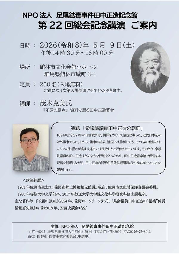 イベントのご案内 ![]() ◆◆第22回総会記念講演 ご案内◆◆ 演題『衆議院議員田中正造の朝鮮』 日時 : 2026年5月9日(土) 14:30 〜 16:00 場所 : 館林市文化会館 小ホール (群馬県館林市城町3−1) 定員 : 250名(入場無料) 講師 : 茂木 克美氏 (『不屈の原点』資料で語る田中正造著者) 是非、ご来館ください。お待ちしています。 ![]() ![]() 【日時】 2026年3月15日(日)13:30〜16:30 【会場】 館林市城沼公民館 2階 講堂 (館林市松原1‐22‐22) 【講師】 山口 徹さん(足尾鉱毒事件田中正造記念館 監事) 【テーマ】「田中正造の活動と谷中村廃村問題を考える」 〜谷中問題から秋穂銅山鉱毒事件を再考する〜 ぜひご参加ください。 ![]() ![]() 【お知らせ】 やさしく学ぶ 足尾銅山鉱毒事件と田中正造入門講座 第10回『無法・暴力の暗澹あんたんたる世界、 この講座で学び活かせるのか!』 日時 : 2026年3月29日(日) 13:30 〜 16:00(開場 13:00) 場所 : 館林市文化会館 小ホール (館林市城町3−1) 資料代 : 300円(学生無料) 講師 : 赤上 剛氏(田中正造研究家) 是非、ご来館ください。お待ちしています。 ![]() ![]() 【お知らせ】 やさしく学ぶ 足尾銅山鉱毒事件と田中正造入門講座 第9回 『田中正造の生涯 2.』 − 正造思想の根っこはどこから! − 日時 : 2026年2月8日(日) 13:30 〜 16:00(開場 13:00) 場所 : 館林市文化会館 小ホール (館林市城町3−1) 資料代 : 300円(学生無料) 講師 : 赤上 剛氏(田中正造研究家) 是非、ご来館ください。お待ちしています。 ![]() ![]() 【第23回 企画展】 小学生による「足尾銅山調査隊」 ― 活動報告 part 2 ―』 展示期間 : 2026年1月6日(火) 〜 4月12日(日) 会場 : 足尾鉱毒事件田中正造記念館 企画展示室 是非、ご来館ください。お待ちしています。 ![]() ![]() 【お知らせ】 やさしく学ぶ 足尾銅山鉱毒事件と田中正造入門講座 第8回 『田中正造の生涯 1.』 名主、自由民権家、県議・衆議院議員、鉱毒事件闘争、谷中村闘争 日時 : 2025年11月9日(日) 13:30 〜 16:00(開場 13:00) 場所 : 館林市文化会館 小ホール (館林市城町3−1) 資料代 : 300円(学生無料) 講師 : 赤上 剛氏(田中正造研究家) 是非、ご来館ください。お待ちしています。 ![]() ![]() 今回のフィールドワークは、今年の八月にオープンしたばかりの 「足尾銅山記念館」を見学する予定 です。 足尾銅山の開発振興、町の発展、公害の発生と、 その歴史が展示されており被害地の立場とは違った視点での足尾銅山を 認識できる機会かと思いますのでじっくりと御覧ください。 恒例の体験植樹も行います。足尾に緑を復元する一助になると思います。 皆様のご参加をお願いいたします 。 足尾・植樹と「足尾銅山記念館」を訪ねる 【日時】 2025年11月2日(日)雨天決行 受付開始 7:30 / 出発 8:00 / 解散見込 18:00 【集合場所】 館林市南面駐車場(館林市役所南側駐車場) 【募集定員】 45名(先着順) ※大型バス 定員になり次第締め切ります 【参加費】 5,000円 当日集合場所にて納入してください (参加費には、植樹費用、入館料、バス代、資料代を含みます) 皆様のご参加をお待ちしております。 ![]() ![]() 【お知らせ】 やさしく学ぶ 足尾銅山鉱毒事件と田中正造入門講座 第7回 『足尾銅山鉱毒事件で消えた二つの村 松木村と谷中村』 その2『谷中村』 日時 : 2025年10月12日(日) 13:30 〜 16:00(開場 13:00) 場所 : 館林市文化会館 小ホール (館林市城町3−1) 資料代 : 300円(学生無料) 講師 : 赤上 剛氏(田中正造研究家) 是非、ご来館ください。お待ちしています。 ![]() ![]() 【第22回 企画展】 『足尾銅山鉱毒事件 女たちの闘い ― 女押し出しと支援する人々 ―』 展示期間 : 2025年9月16日(火) 〜 12月21日(日) 会場 : 足尾鉱毒事件田中正造記念館 企画展示室 是非、ご来館ください。お待ちしています。 ※当初9月6日(土)から『第22回企画展』の展示を予定しておりましたが 諸事情により9月16日(火)から展示することになりました。 9月6日(土)〜14日(日)の間にご来館を予定されていた皆様にはご迷惑を おかけし、大変申し訳ございません。12月21日(日)まで展示しておりま すので、ぜひご来館ください。お待ちしております。 ![]() ![]() 今回のフィールドワークは、鉱毒の被害地であり、 正造の分骨地の一つである足利市を訪ねます。 ここでは田中正造の最側近として最後まで支えた嶋田宗三、 正造の甥で経済面で支援していた原田定助、 正造の妹リンの墓地を訪ね、墓参を計画しました。 徳蔵寺では、当時4歳だったご住職に講演していただく予定です。 『鉱毒被害の激甚地、足利市を訪ねる』 (田中正造ゆかりの地巡りとナシ狩り) 【日時】 2025年8月24日(日)雨天決行 受付開始 7:30 / 出発 8:00 / 解散見込 16:30 【集合場所】 館林市南面駐車場(館林市役所南側駐車場) 【募集定員】 45名(先着順) ※大型バス 定員になり次第締め切ります 【参加費】 5,000円 当日集合場所にて納入してください (参加費には資料代、保険料、梨2個(土産)を含む) ※梨狩りは別途受け付けます 皆様のご参加をお待ちしております。 ![]() ![]() 【お知らせ】 やさしく学ぶ 足尾銅山鉱毒事件と田中